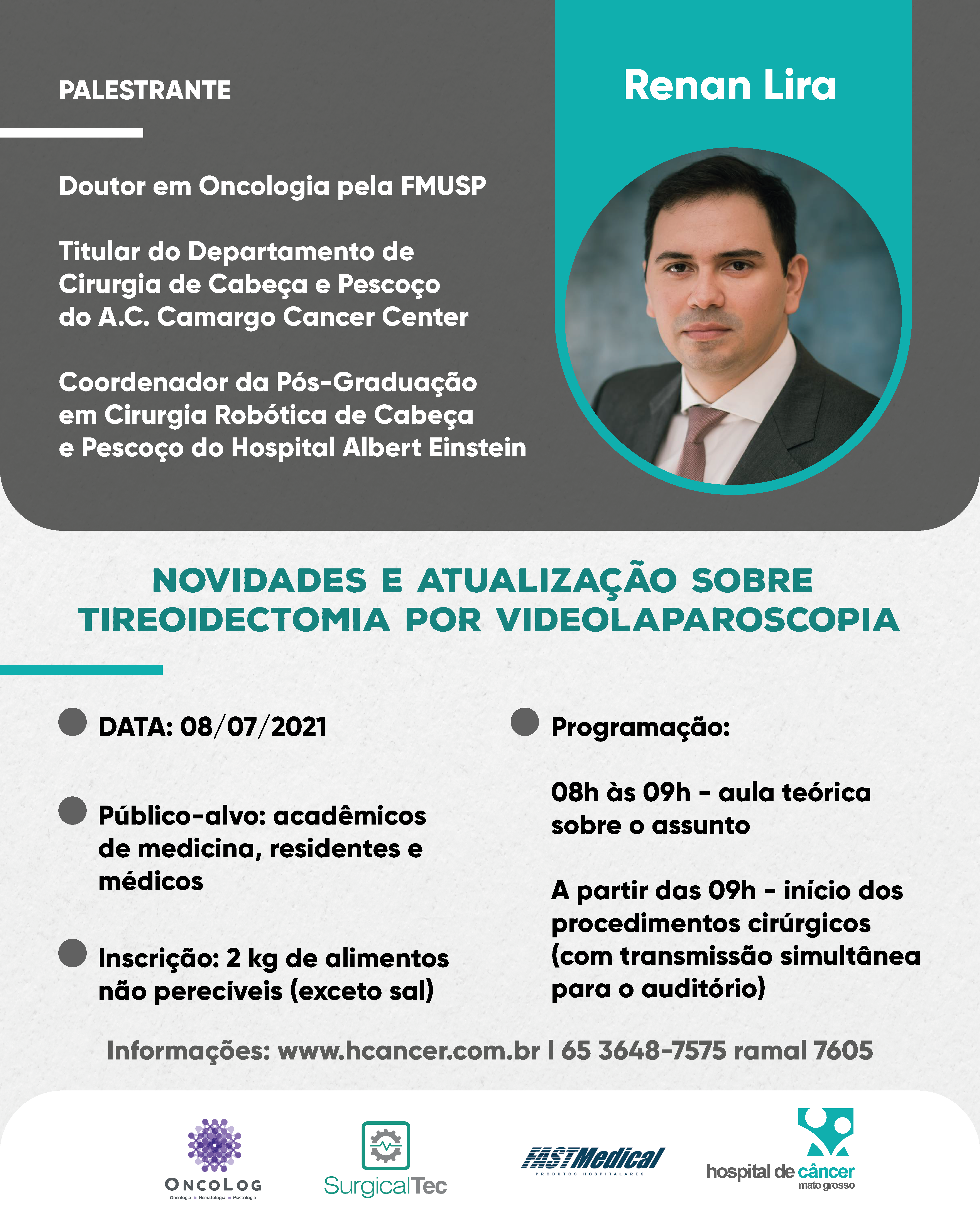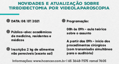 Com o objetivo de compartilhar informações sobre inovação e novas tecnologias, no dia 08 de julho será promovida no Auditório do Hospital de Câncer de Mato Grosso uma atualização científica sobre “tireoidectomia por videolaparoscopia”.