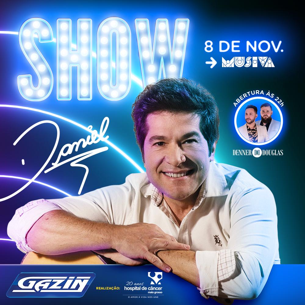 Um show que encantará corações e ainda ajudará uma grande causa. Já estão à venda os ingressos para o show do cantor sertanejo Daniel, que será realizado no dia 08 de novembro na Casa de Shows Musiva. O evento faz parte da comemoração dos 20 anos do Hospital de Câncer de Mato Grosso (HCanMT) e está sendo promovido pela Gazin.