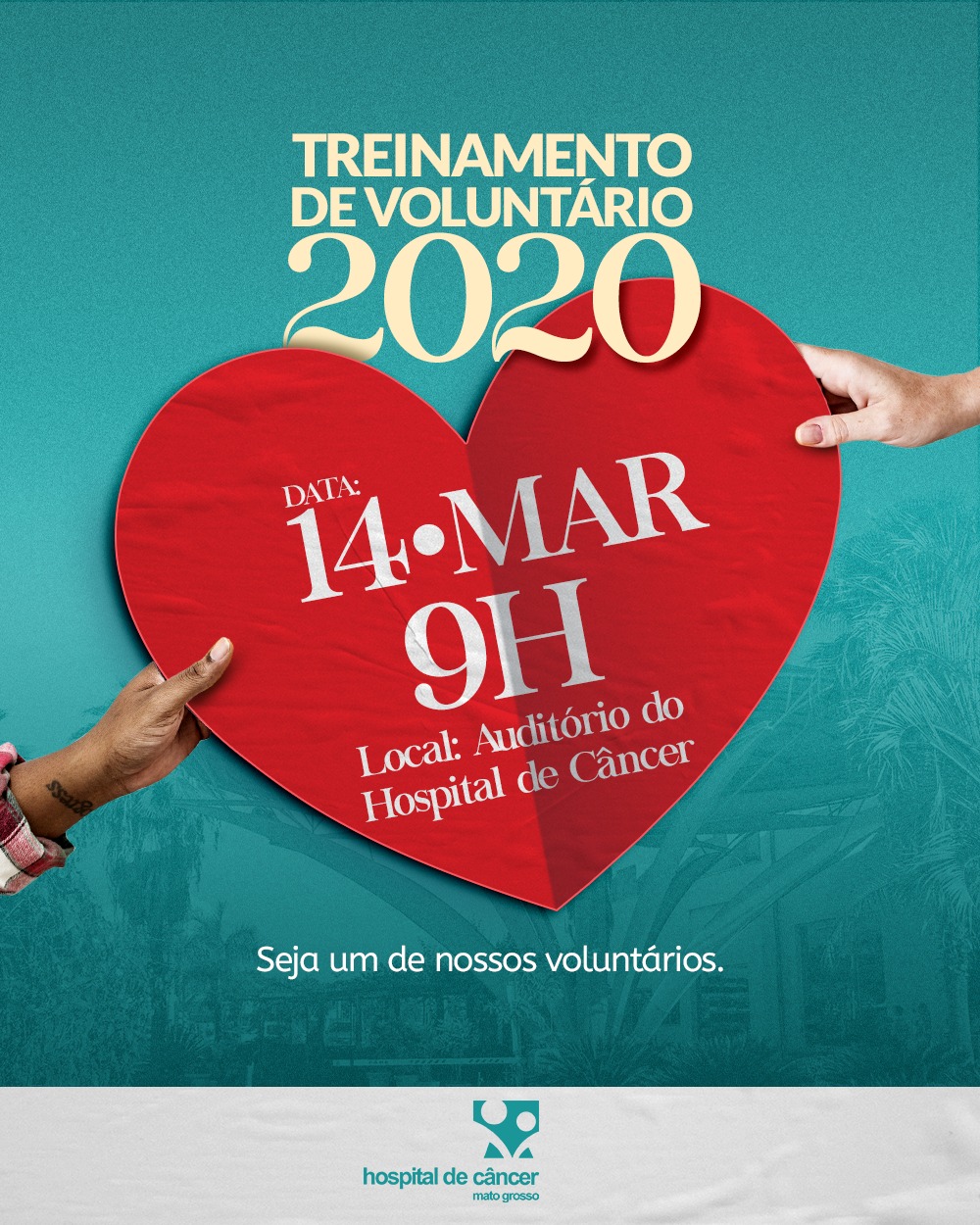 As pessoas que queiram doar amor podem comparecer ao 1º Treinamento de Voluntários de 2020 no dia 14 de março. O evento será no auditório do Hospital de Câncer de Mato Grosso (HCanMT), com início às 9 horas. Não é necessário fazer inscrição, basta comparecer na data.