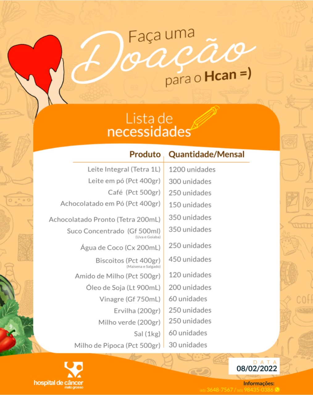 O Hospital de Câncer de Mato Grosso (HCanMT) pede ajuda da sociedade mato-grossense na doação de alimentos. Neste momento, os estoques estão quase zerados de leite integral, suco concentrado, café, achocolatado em pó, caixinha de água de coco, biscoito de maisena e salgado, sal, óleo de soja e demais alimentos.