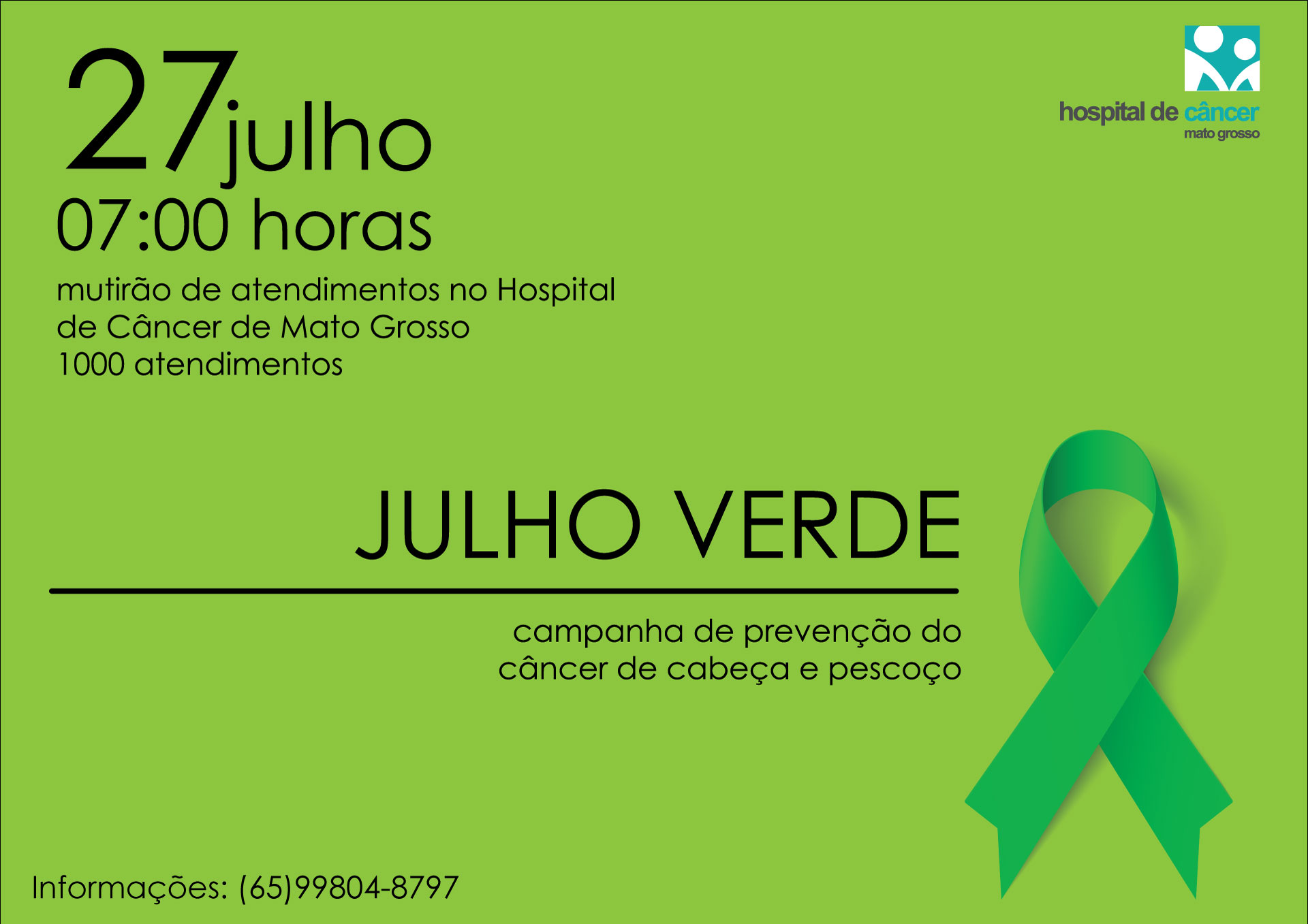 No dia 27 de julho o Hospital de Câncer de Mato Grosso (HCanMT) atenderá gratuitamente mil pessoas com suspeita de câncer de cabeça e pescoço. As senhas serão entregues a partir das 7 horas na recepção do Hospital. O objetivo da ação é mobilizar as pessoas para o Julho Verde, mês de conscientização do câncer de cabeça e pescoço, e que os casos suspeitos recebam encaminhamento direto para tratamento no HCanMT.