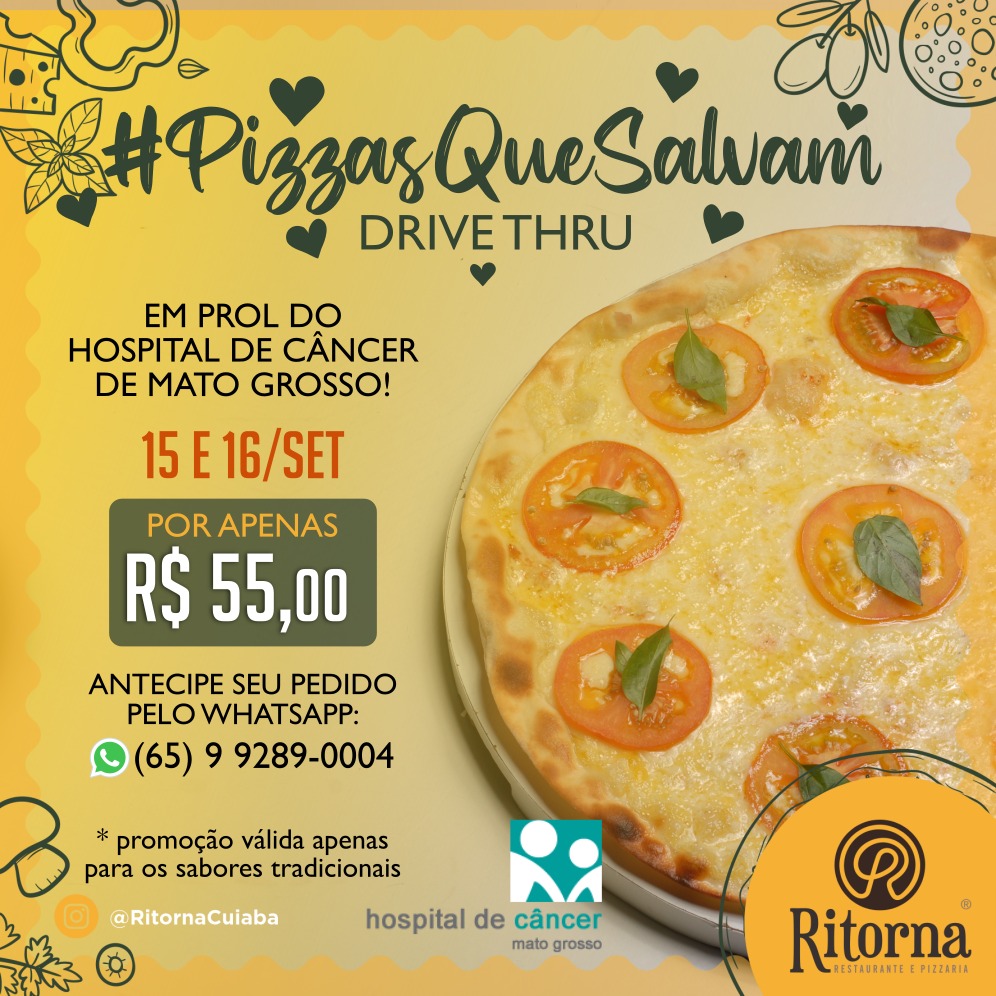Para tudo que vem coisa boa demais por aí!!! Que tal saborear uma pizza deliciosa e ainda ajudar o nosso HCanMT? O Hospital e a Ritorna Restaurante e Pizzaria estão com a campanha Pizzas que Salvam.